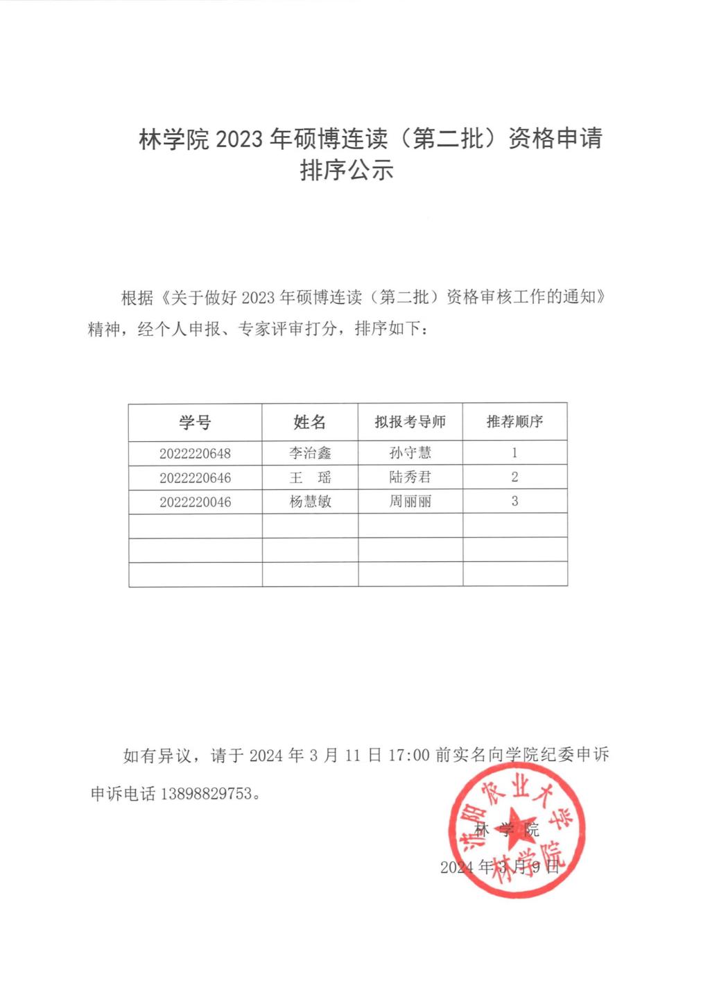 林学院2023年硕博连读(第二批)资格申请排序公示