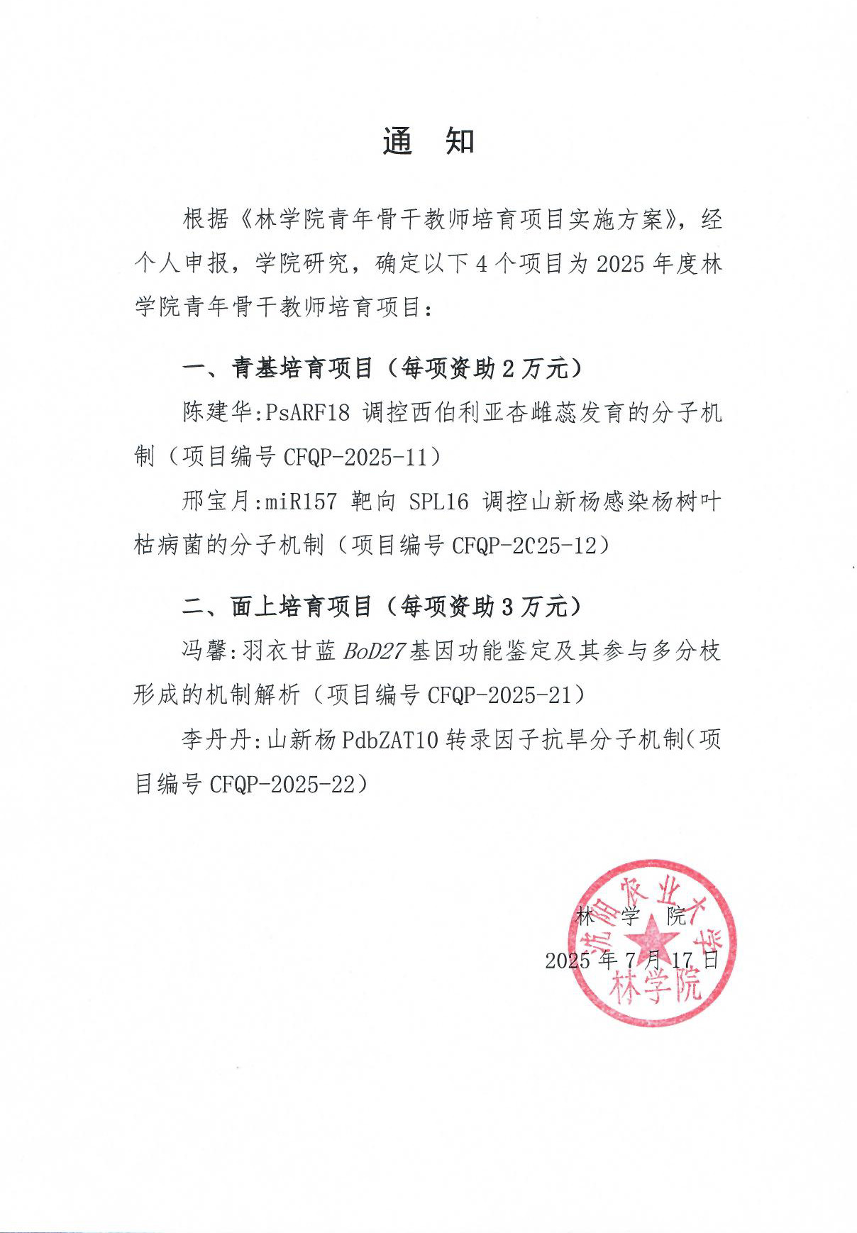 关于公布2025年度“青培项目”遴选结果的通知