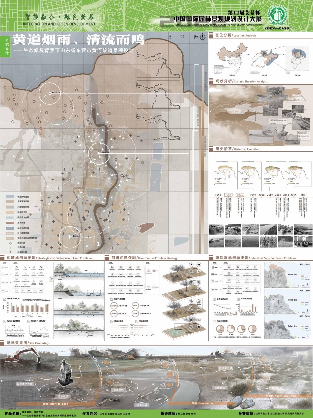 沈阳农业大学为第一完成单位,2021级风景园林专硕王佳立为第一完成人,杨立新副教授为第一指导教师的参赛作品《黄道烟雨、清流而鸣——生态修复背景下山东省东营市黄河故道景观设计》针对山东省东营市刁口河段黄河故道存在河道萎缩、土壤盐渍化和生态质量下降等问题,以营造烟雨朦胧、水清鸟鸣、生机盎然的自然景观为设计目标,基于生态规划原理,采用工程技术手段,试图通过适应自然环境的生态改造,建立天人合一人地和谐关系,保护当地生物多样性。该作品在高校组网络投票中排名第一,并最终获评金奖。