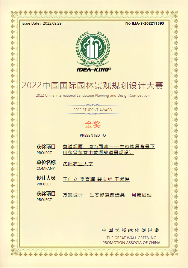 日前,在第12届艾景奖——2022中国国际园林景观规划设计大赛中,我院教师杨立新副教授指导风景园林硕士研究生王佳立,荣获金奖。