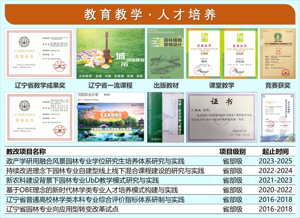 近五年主持省级教改项目 6 项,校级教研课题 9 项;荣获辽宁省本科教学成果奖 2 项;入选省级一流本科课程 2 门,校级一流本科课程 3 门;指导本科生 176 人,研究生 65 人;指导国家级大学生双创训练计划项目 4 项、省级 6 项,获省级大学生双创竞赛铜奖 1 项;指导学生参加风景园林规划设计竞赛获国家级金奖 1 项、铜奖 3 项,省部级奖 5 项;入选沈阳市高层次人才 4 人,沈阳农业大学教学名师 1 人。