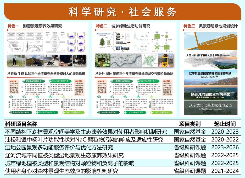 近五年承担国家自然科学基金项目 3 项,省级科研课题 9 项,市厅级科研课题 4 项;在《Urban Forestry & Urban Greening》《Forests》《生态学杂志》等期刊发表学术论文 31 篇(SCI收录16篇),出版教材 2 部,获国家发明专利 2 项;完成森林公园、乡村景观、生态建设等规划设计项目 8 项;对接服务辽宁乡村振兴示范村 2 个;作为技术支撑团队之一,牵头申报建立了国家林业和草原局辽宁医巫闾山森林生态系统国家定位研究站。