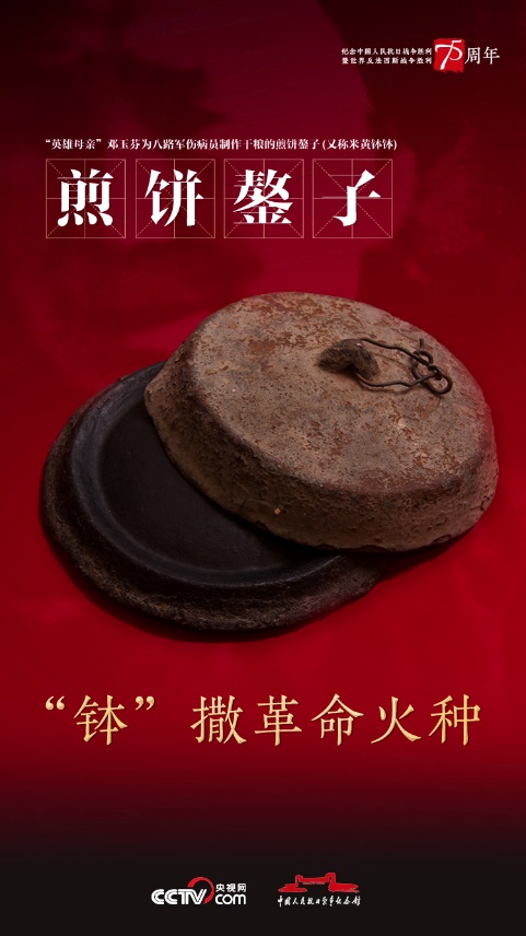 这是邓玉芬为八路军伤病员制作干粮的炊具,学名煎饼鏊子,当地称为米黄钵钵。抗战时期条件非常艰苦,邓玉芬老人省吃俭用,将节省出来的粮食用煎饼鏊子制成干粮,送给八路军伤病员,好让他们早日养好伤,重上战场多杀敌人。