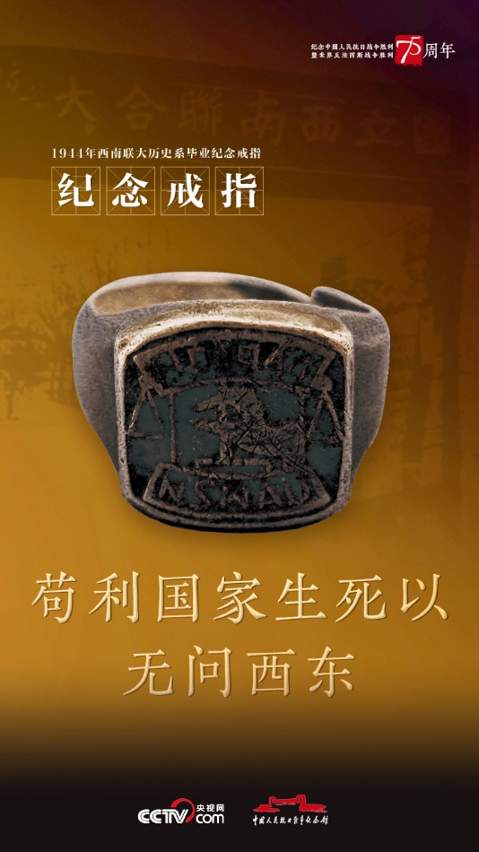1943年,大批学生响应政府号召,投笔从戎,参加中国远征军、驻印军。将于1944年毕业的历史系学生,在毕业前入伍,从军前设计了此戒指,历史系全体学生通过,作为毕业纪念品。戒指正面中间为天平上以手执笔的图案意思为作史应秉笔直书不能有所偏袒;上部为“H D 1944 ”字样,意为“History Department 1944”及历史系1944级;下部为“N S W A U”字样,意为“National Southwest Associate University”即国立西南联合大学。
