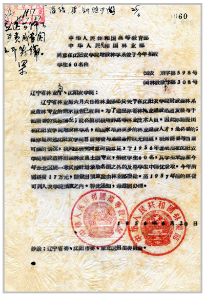 林学院源于复旦大学1952年北迁沈阳的观赏组造园专业和原沈阳农学院森林系,1956年成立林学系,1994年组建林学院。 ■1949年,沈阳农学院创建森林系。 ■1950年,复旦大学农学院组建观赏组,学生从园艺专业1949级和1950级转入;沈阳农学院(含森林系)北迁,与哈尔滨农学院合并,恢复东北农学院原称。 ■1952年,复旦大学农学院(茶学专业除外)北迁沈阳,观赏组教师和两个年级本科生调整至我校园艺系;同年,东北农学院森林系部分教师返回我校。 ■1953年,园艺系观赏组首届18名本科生毕业(获造园专业本科文凭),成为新中国首批园林绿化高级人才。 ■1956年,中华人民共和国高等教育部、林业部批准我校成立林学系,增设造林附森林改良土壤专业(现林学专业),并于当年招生。